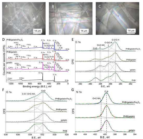 Optical microscope photographs (A–C) of pure PHB (A), PHB/gelatin (B) and PHB/gelatin/Fe3O4 scaffolds (C). Survey XPS spectra of the synthesized pure PHB, PHB/gelatin and PHB/gelatin/Fe3O4 scaffolds (D). High-resolution XPS spectra of C 1s, O 1s and N 1s regions for pure gelatin, pure PHB and composite scaffolds with addition of gelatin and Fe3O4 (E–G).