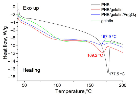 DSC curves obtained for pure gelatin as well as pure PHB, PHB/gelatin, PHB/gelatin/Fe3O4 scaffolds.