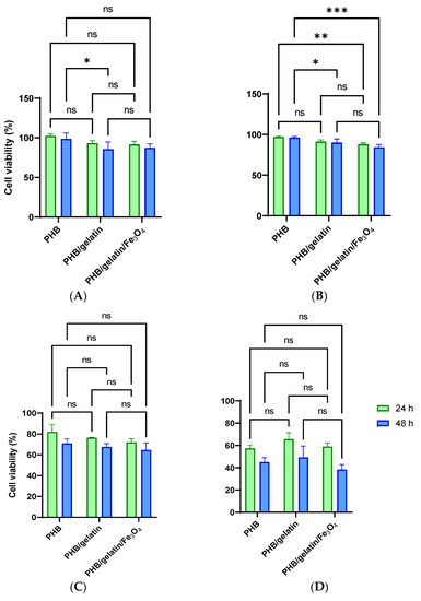Cytotoxicity of pure PHB, PHB/gelatin, PHB/gelatin/Fe3O4 scaffolds for HeLa (A,C) and GF (B,D) cells. The data obtained in accordance to ISO 10993-5:1999 using extracts from the material (A,B) and the method of direct contact (C,D). Cells seeded in the same number on tissue culture plastic were used as a control (100%). Results are presented as means ± SD (*** p < 0.001, ** p < 0.01, * p < 0.05, and (ns) points to a non-significant difference).
