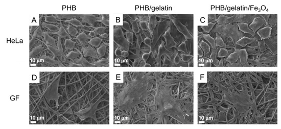 SEM images of HeLa (A–C) and GF (D–F) cell adhesion to PHB, PHB/gelatin, PHB/gelatin/Fe3O4 scaffolds.
