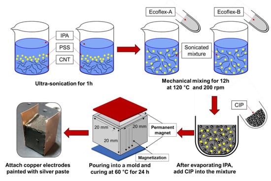 In the present study, Ecoflex® 0010 of poly-butylene adipate-co-terphthalate (PBAT) is utilized as the polymeric matrix. It is a flexible polymer matrix, widely used in related research [5,18], and the detailed chemical specification Ecoflex® 0010 is explained in the study by Wei et al. [19]. Carbonyl iron powder (CIP) and multi-walled carbon nanotube (CNTs) were used as conductive fillers to fabricate the polymeric composites. Here, CNTs were included in the composites for ensuring favorable electrical conductivity; thus, the target electrical resistance of the fabricated samples was decided as less than 1 kΩ. To obtain the proper CNTs contents, four different CNTs (0.5, 0.75, 1.0, and 2.0 wt.%) were chosen to fabricate the samples. The detailed specifications of the utilized CNTs and CIP were summarized in Table 1. The polysodium4-styrenesulfonate (PSS) was utilized to disperse the CNT bundles in the polymeric matrix [20]. The fabrication process of the samples is described in Figure 1. CNTs and identical amounts of PSS were added to a beaker with 100 mL of volatile solvent (Isopropyl-alcohol, IPA), and the mixtures were hand-mixed for 1 min. Afterward, they were sonicated for an additional 1 h via a bath-typed ultra-sonicator (40 kHz; 200 W). Ecoflex® was then added to the sonicated mixtures, and they were heated for 12 h at 120 °C with stirred at 200 rpm to both improve the dispersion of CNTs and evaporate the IPA solvent in the Ecoflex® matrix. After 12 h, CIP 50% by polymer weight was added to the mixtures, and they were hand-mixed for an additional 3 min. The mixtures were cured in a 20 20 20 mm3 mold at an oven with a temperature of 60 °C for 24 h (Figure 1). During the curing, the samples were located under the magnetic field to form the CIP-based chain structures in the samples as described in the fabrication process of samples in the previous study [18,20].