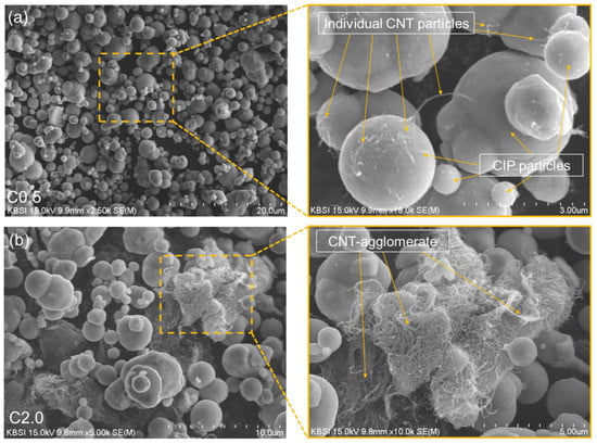 SEM images of CNT and CIP-based conductive networks in the samples with (a) CNT 0.5% and (b) CNT 2.0%.