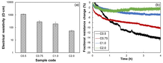 The electrical resistivity values of the samples are shown in Figure 3. The electrical resistivity of the samples decreased from 1.13 kΩ·cm to 54 Ω·cm as the incorporated CNTs content increased from 0.5 to 2.0%, respectively. According to these results, it can be said that the dramatic reduction in electrical resistivity was found in the incorporated CNTs contents range from 0.5 to 0.75%. This range is called a percolation threshold where the denser conductive networks start to form, decreasing the electrical resistivity dramatically. The percolation threshold range found in the present study is similar to the previous studies, indicating the well-dispersion of the CNTs in the samples (Figure 3a). The electrical stability of the samples for 4 h is illustrated in Figure 3b. The fractional resistance change of C0.5 sample after 4 h was approximately −14.5%, while that of C0.75, C1.0, and C2.0 samples were −10.15, −4.86, and −2.20%, respectively. This result can be explained by the tunneling effects which are commonly known as the nature of CNTs. Due to the tunneling effect, the electrons can skip over the insulating polymer matrix and move easily to the adjacent CNT particles when the electrical current has applied to the composites [21]. Thus, the electrical resistance between the CNT particles is decreased over time with increasing the electrical conductivity of the composites, as seen in Figure 3b. In particular, it can be observed that the tunneling effect decreased as the incorporated CNTs content increased (Figure 3b). As the incorporated CNT content increases, the adjacent CNT particles draw closer. The shortened distance between CNT particles reduces the tunneling effect because the tunneling effect is inversely proportional to the distance between CNT particles, showing close agreement with the previous studies [5,21].
