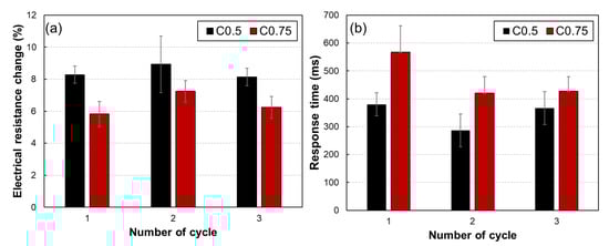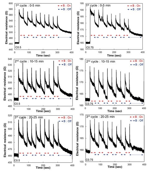 The process as described in Figure 4 was repeated for three cycles to C0.5 and C0.75 samples to investigate the sensitivity and repeatability, and the results are shown in Figure 5. The initial electrical resistances of the samples decreased with an increase in the cycles, regardless of the CNT contents, which can be explained by the tunneling effect as observed in Figure 3. Nonetheless, notable changes in electrical resistance were observed as the magnetic field was applied to both samples during the cyclic test, indicating a possibility of using them as magneto-sensors (Figure 5). Then, the magneto-sensing sensitivity and response time were investigated in Figure 6. As observed in Figure 6, the average reduction in electrical resistance of C0.5 sample caused by the applied magnetic field was approximately 42.9 Ω, 43 Ω, and 38 Ω in the first to the third cycle, respectively, and can be converted to 8.3%, 8.9%, and 8.1% of magneto-sensitivity, respectively. For the C0.75 sample, the variation in electrical resistance caused by magnetic field stimulus change was approximately 10 Ω to 11 Ω, indicating 5.8%, 7.2%, and 6.2% of magneto-sensitivity, respectively. Even the absolute value of electrical resistance changes over iterations, the magneto-sensing sensitivity is stable at approximately 8% and 6% for the C0.5 and C0.75 samples, respectively. In addition, the response time is calculated by observing the time interval between the instant the magnetic field is applied and the instant resistance peak is reached, as shown in Figure 6b. The response time of C0.5 and C0.75 samples exhibited about 350 ms and 450 ms, respectively. The fabricated samples showed similar values of response time with the values observed in previous studies that showed the response time of Ecoflex®-based composites around 332 ms due to the ultra-high viscoelastic properties [22,23].