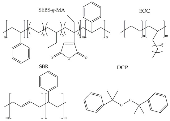 - Styrene-ethylene/butylene-styrene grafted with maleic anhydride with tradename TAIPOL SEBS 7126—it is characterized by bond maleic anhydride content 1.2–1.8 wt.%, melt flow index (5 kg at 230 °C) 15–25 g/10 min, and volatile matter maximum 0.5 wt.%. The copolymer was supplied by TSRC Corporation (Kaohsiung, Taiwan).