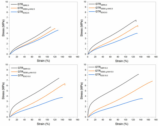 The physico-mechanical properties of modified GTR are summarized in Table 4. For a better comparison of the obtained results, the stress-strain curves are presented in Figure 4. For a higher amount of modifier in GTR, a slight increase in elongation at break was observed. The most significant change was noted for SEBS-g-MA modified GTR, from 120 ± 6% to 170 ± 5%. Moreover, it can be seen that the higher content of the SEBS-g-MA or SBR modifier, the higher value of tensile strength was determined. The maximum value of this parameter reached 6.9 ± 0.1 MPa (for GTRSEBS-g-MA15.0) and 8.1 ± 0.3 MPa (for GTRSBR15.0). Surprisingly, the presence of EOC in modified GTR contributed to the deterioration of the tensile strength. It decreased proportionally from 4.5 ± 0.1 MPa (GTREOC2.5) to 3.5 ± 0.3 MPa (GTREOC15.0). This may be related to the low stiffness of the material, which also contributed to the slight reduction of hardness. For GTR modified by SEBS-g-MA a constant value of hardness (66–67 Shore A) was noted, while for GTR modified by SBR a significant improvement in this parameter (from 71 to 84 Shore A) was observed with the increasing content of the modifier.