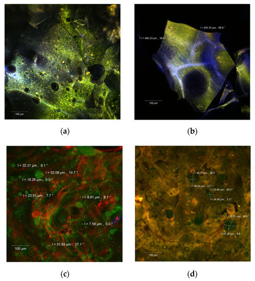 The confocal laser scanning microscopy (CLSM) images of the native, unstained (a,b), and fluorophore dyed powders (c,d).