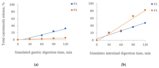 The carotenoids from both powders were released in the intestinal environment (Figure 2b). P1 presented a maximum release of 82.47 ± 0.22%, while P2 presented a 47.14 ± 0.44% release after 2 h of digestion. Hence, the carotenoid microencapsulation in a mixture of proteins and polysaccharides delayed the release in the gastric phase and enhanced it in the intestinal phase. Neagu et al. [26] also reported a low release in the gastric phase of the total carotenoids from sea buckthorn extracts encapsulated in WPI and casein. However, in the intestinal phase, they observed only a 42% release.