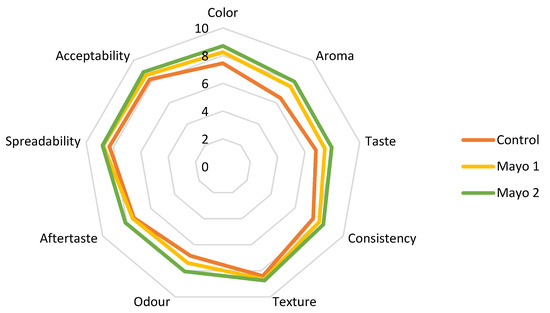 The impact that a product has on consumers is one of the most significant characteristics. The sensory analysis must be present when we talk about a new product with added value. Therefore, the mayonnaise sauces were analyzed using a nine attributes scale based on a unit numbering. The followed characteristics are the color, aroma, taste, consistency, texture, smell, aftertaste, spreadability, and acceptability. Sensorial analysis was performed at 20 °C, under white light, and 45–47% relative air humidity by a panel of 20 tasters. After each sample, the participants rinsed their mouths with plain water. The 20 tasters were untrained consumers with ages ranging from 25 to 55 years old (80% women and 20% men). They received specific training on the sensory attributes relevant to the mayonnaise sauce formulation developed in our study using a range of commercial products. The sample preparation method and its safety for the body were explained to obtain written consent before participation.