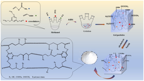The gelatin particles synthesized in the reaction were added to a methanol solution of 0.5 mol/L NaOH at room temperature, with mechanical stirring throughout the whole process. Meanwhile, a methanol solution of 0.5 mol·L−1 NaOH was continuously added until the solution showed weak alkalinity, and could transform -OCOCH3 on the surfaces of gel particles into -OH, and transform -COOH into -COONa. In the alcoholysis stage, a lot of heat was produced, producing some colored substances because of side reactions if the temperature in the system was too high. Then, the obtained poly (vinyl alcohol-acrylic acid-triallyl cyanate) (PVA-AA-t) was rinsed with anhydrous methanol several times and dried in a vacuum at 50 °C until all of the solvents were removed. Finally, the dried samples were ground to an appropriate size by a ball mill, the reaction and alcoholysis of PVA-AA-t is shown in Figure 1. The alcoholysis of PAA and PAA-t was carried out in aqueous sodium hydroxide solution (0.5 mol·L−1). The specific operation steps were the same as for the alcoholysis of PVA-AA-t.