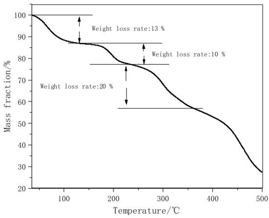 Figure 3 shows the TG curve of PVA-AA-t. Under a nitrogen atmosphere, the mass decreases for the first time at 50–100 °C, and the weight loss rate is 13%. This is mainly because the polymer absorbs moisture at room temperature. The weight loss rate of the polymer is 10% at 180–215 °C, because the carboxyl group in the polymer molecular chain is removed. The weight loss rate at 270–340 °C is 20%, which is caused by the breaking and decomposition of the ester or hydroxyl bonds in the molecular chain. When the temperature is higher than 430 °C, the mass of the polymer decreases rapidly, due to the fracture and decomposition of C-C in the main chain of the polymer. In general, the structure of the polymer is damaged when the temperature is higher than 180 °C, so it can be used in below 150 °C without damaging the properties of the polymer.
