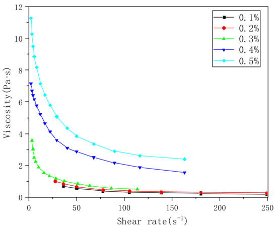 We dissolved the PVA-AA-t in water and tested the viscosity, as shown in Figure 4. With the increase in the polymer’s concentration, the viscosity of the aqueous solution increases exponentially. When the concentration is less than 0.2%, the viscosity is less than 1 Pa·s (when the solution concentration is only 0.1%, there is almost no thickening effect). When the concentration increases to 0.3%, the viscosity increases rapidly to 4 Pa·s. The viscosity of 0.5% aqueous solution can reach 11 Pa·s, showing a clear thickening effect similar to that of other thickeners. Under shear force, with the increase in shear rate, the viscosity of the solution decreases rapidly, showing the characteristics of a pseudoplastic fluid.