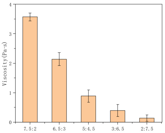 Figure 5 shows the variation in the viscosity of PVA-AA-t solutions with different monomer ratios. It can be seen from the figure that the viscosity is the highest when VAc:AA = 7.5:2, reaching 3.6 Pa·s. With the increase in the AA content of the copolymer, the initial viscosity decreases gradually. When the ratio of VAc:AA is 6.5:3, the initial viscosity drops to 2.14 Pa·s. When the ratio of VAc:AA is 2:7.5, the whole system has no thickening effect, showing Newtonian fluid characteristics. As can be seen from previous literature [16,26], sodium polyacrylate has been used as a thickener for many years; however, under these experimental conditions, we found that increasing the content of acrylic acid did not further improve the thickening effect—possibly due to the simultaneous copolymerization of three monomers in the system, affecting their respective reaction rates. Moreover, at high temperatures, the reaction rate of AA is faster than that of VAc, and the formed molecular chain is shorter, which leads to a poor thickening effect. On the other hand, VAc with a relatively slow reaction rate can form long-chain molecules at this temperature (65 °C).