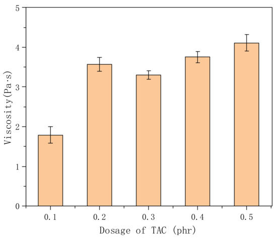 In this experiment, triallyl cyanate (TAC), which contains three ethylene groups, was used as a crosslinking agent. The crosslinking structure can be formed in the reaction process, and the more TAC is used, the higher the crosslinking density. From the Figure 6, we found that the viscosity (1.79 Pa·s) was relatively low when the dosage of TAC was 0.1 phr, which may have been due to the low dosage of the crosslinking agent, low crosslinking density of the molecular chain, and the polymer stretching and dissolving in water, resulting in the decrease in viscosity. Further increasing the amount of TAC, there was little change in viscosity, because TAC acts as a connecting point in the molecular structure [27], and the carboxyl and hydroxyl groups in the molecular chain play a thickening role. Therefore, from the perspective of application economy, the crosslinking agent is expensive; the dosage of TAC in the synthesis is 0.2 phr.