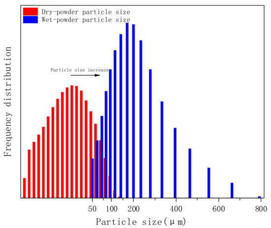 In this experiment, we compared the particle size distribution (PSD) of PVA-AA-t before and after swelling, as shown in Figure 7. The PSD of solid powder was in the range of 0.5–150 μm, the median diameter (D50) was 17.90 μm, and the average particle size was 24.74 μm (note: the solid polymer powder can be continuously ground by a ball mill, and the polymer powder within the fixed particle size range can be selected by standard sample separation). After swelling, the PSD of the polymer was in the range of 20–600 μm, D50 was 156.4 μm, and the average particle size was 187.2 μm. Comparing the two cases, the particle size increased nearly ninefold, showing an obvious tackifying effect. The swelling principle is the combination of non-associative thickening and associative thickening [28]; that is, -COO- in the polymer molecular chain combines with H2O to form hydrated ions, hindering the flow of molecules in the system, so as to achieve the purpose of thickening. On the other hand, the polymer molecular chain contains a small amount of acrylate chain, forming a comb-like structure. These hydrophobic short chains associate with one another to form a network structure, which can enhance the interaction between polymer particles and further increase the viscosity in water.