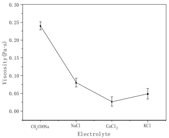 Figure 8 shows the effects of different electrolytes on the viscosity of the polymer solution. Under the same conditions, the viscosity decreases significantly (the original viscosity is nearly 4 Pa·s) after adding electrolytes. This is because the electrolyte can partially shield the carboxyl anion on the polymer molecular chain, resulting in the curling of the stretched macromolecular chain formed by the repulsion from the anions, reducing the friction between the molecular chains, and causing the viscosity to decrease rapidly with the addition of the electrolyte. The influence of different electrolytes on the viscosity follows the sequence CaCl2 > KCl > NaCl > CH3COONa. The greater the charge number of divalent ions at the same mole number, the stronger the shielding effect on the polymer molecules [29]. Compared with K+ and Na+, the larger the ion radius, the better the shielding effect on the charge of the molecular chain, making the molecular chain curl further and the viscosity decrease simultaneously. CH3COONa is a strong base and a weak acid salt. In aqueous solution, CH3COO- hydrolyzes to form CH3COOH, which weakens the shielding effect on the polymer molecular chain compared with the other three electrolytes. In general, the addition of an electrolyte has a great influence on the thickening effect of PVA-AA-t.