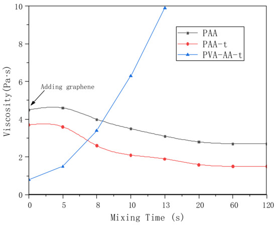 The changes in the viscosity of graphene dispersion slurry (polymer concentration: PAA: 1%; PAA-t: 1%; PVA-AA-t: 0.1%; Gr: 0.5%).