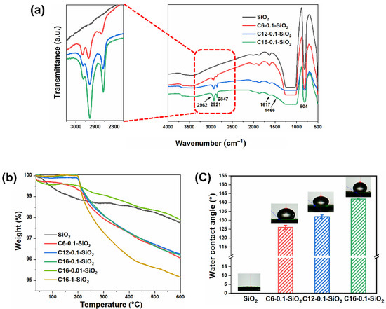 Figure 1c depicts the results of WCA measurements for SiO2 samples. Without organic modification, the SiO2 surface was highly hydrophilic (WCA = 0°) due to the presence of surface hydroxyl groups. The modification with silane coupling agents significantly increased WCAs to 126–142°, indicating that the original hydrophilic surface changed to hydrophobic one due to the presence of aliphatic chains. The WCAs were found to be larger when the chain length increased from C6 to C12 regardless of a lower grafting density. These results pointed out that it is easier for a longer alkyl chain to shield the surface from water by forming a hydrophobic network [53].