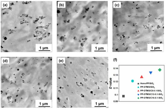 TEM images of nanocomposites: (a) HomoPP/SiO2, (b) PP-OTMS/SiO2, (c) PP-OTMS/C6-0.1-SiO2, (d) PP-OTMS/C12-0.1-SiO2, and (e) PP-OTMS/C16-0.1-SiO2. The SiO2 content was 5.0 wt% for all the samples. (f) The dispersion parameter (D) acquired from TEM images.