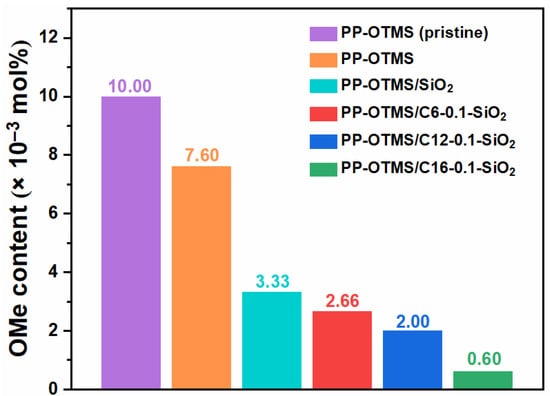 During the melt mixing process, the OMe groups of PP-OTMS can react with surface silanol groups of SiO2 to form Si-O-Si bonds, by which PP-OTMS grafts to the SiO2 nanoparticles [39]. To confirm the occurrence of in situ grafting, the OMe content before and after melt mixing was analyzed by 1H NMR (Figure S3). As shown in Figure 3, even in the absence of SiO2, a part of OMe groups was consumed during melt mixing. This suggests that the OMe groups belonging to different chains can react with each other, most plausibly via hydrolysis/condensation with the aid of residual water. In the presence of SiO2, the decrease in the OMe content became more pronounced, which indicated the occurrence of in situ grafting. The consumption of the OMe group was greater for modified SiO2 as compared to unmodified one, even though surface silanol groups were partially consumed by the organic modification. This result evidenced the importance of initial dispersion on the efficiency of the in situ grafting. The consumption of the OMe groups increased along with the alkyl chain length, in agreement with the improved dispersion parameter in Figure 2f. It is plausible that the improved dispersion of modified SiO2 provided more contact interfaces to promote the grafting reaction.
