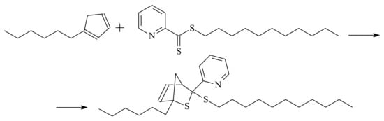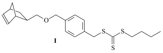 A number of norbornenyl-terminated polymers, e.g., PS and poly(N-isopropyl acrylamide), were synthesized via RAFT polymerization using the norbornenyl-functionalized RAFT agent, 4-({[2-exo]-bicyclo[2.2.1]hept-5-en-2-ylmethoxy} methyl)benzyl butyl carbonotrithioate (I) presented in Figure 1, and coupled with tetrazine-terminated polymers, poly(d-valerolactone), and poly(ethylene glycol).