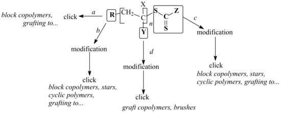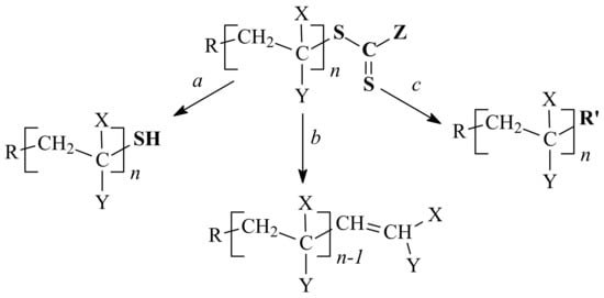 A macromolecule formed through the RAFT mechanism contains a thiocarbonylthio ZC(=S)S group on its ω end. The amount of these chains is determined by efficiency of the RAFT agent and the molar ratio of the RAFT agent to initiator decomposed by the time that the polymerization is completed [40]. The ZC(=S)S group is rather convenient for further modifications, e.g., reactions with nucleophiles resulting in thiol formation (a), thermolysis or radical-induced oxidation providing C=C bond formation at the chain end (b), addition–fragmentation coupling with the radical initiator (c), etc. (Scheme 12) [45,46,47]. Some products of the above reactions may be considered as precursors for click reactions. We will address these cases below and classify them by the chemical nature of the stabilizing group Z in the RAFT agent.