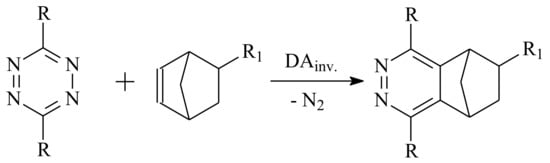 Among additive-free clicking reactions, a tetrazine–norbornene inverse-electron-demand Diels–Alder conjugation (DAinv) was successfully applied to polymer–polymer coupling [80]. The reaction between tetrazines and strained alkenes or acetylenes yields dihydropyridazines or pyradizines (Scheme 4). It is fast, atom-efficient, catalyst-free, air-insensitive, and quantitative so that all requirements of the click concept [82] are fulfilled.