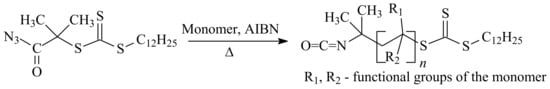 Another methodology for the synthesis of α-functional polymers in a one-pot simultaneous polymerization accompanied by an isocyanate “click” reaction was described in [94]. It is based on the preparation of a carbonyl-azide RAFT agent precursor that undergoes in situ Curtius re-arrangement during RAFT polymerization, yielding well-controlled polymers modified with α-isocyanate (Scheme 9). Their coupling with polymers bearing a terminal OH group may easily result in the formation of block copolymers.