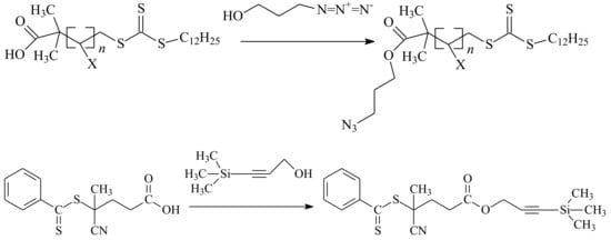 The copper-catalyzed azide–alkyne cycloaddition is routinely used for the RAFT-based polymer end-coupling. In that regard, a number of azide, alkyne, and trimethylsilyl-protected alkyne functional RAFT agents have been described in the literature (Table 1). Their application results in the end-functionalized polymers, e.g., polystyrene (PS) and poly(vinyl acetate) (PVAc) [49,50], as well as PVAc and glycopolymer [51], which can be clicked together to produce block copolymers or grafted onto inorganic or organic nanoparticles [52,53,54,55]. Since both protected and unprotected alkyne groups keep their functionality in the course of radical polymerization, protection of the alkyne substituent makes little sense.