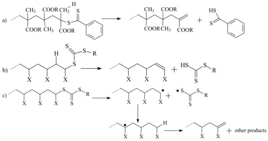 As opposed to other polymeric RAFT agents, xanthate-based polymers can be transformed to polymeric thiols by simple heating either in bulk or solution [161,162]. At high temperature, which depends on the nature of a leaving R group in polymeric xanthates (Table 3), the Chugaev elimination occurs producing a polymeric thiol and alkene (Scheme 14) [161]. This mechanism holds independently of the nature of the monomer unit bound to the xanthate group (styrene, t-butyl acrylate, or dimethyl siloxane).