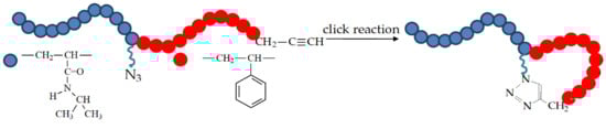 Among different polymers, PS, polyacrylates, and polyacrylamides are the most common [49,50,51,52,53,54,55,56,57,58,59,60,61,62,63,64,65,66,67,68,69,70,71,72,73,74,75,76,77]. Sometimes, methacrylic monomers are involved in the combination of RAFT polymerization with click chemistry [78,79]. However, amine-containing monomers (e.g., vinyl pyridine) should be used with caution because of the possible complexation with copper ions catalyzing the azide–alkyne interaction.