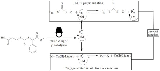 - Wang, J.; Wang, X.; Xue, W.; Chen, G.; Zhang, W.; Zhu, X. Initiator and photocatalyst-free visible light induced one-pot reaction: Concurrent RAFT polymerization and CuAAC click reaction. Macromol. Rapid. Commun. 2016, 37, 799–804. [Google Scholar] [CrossRef]