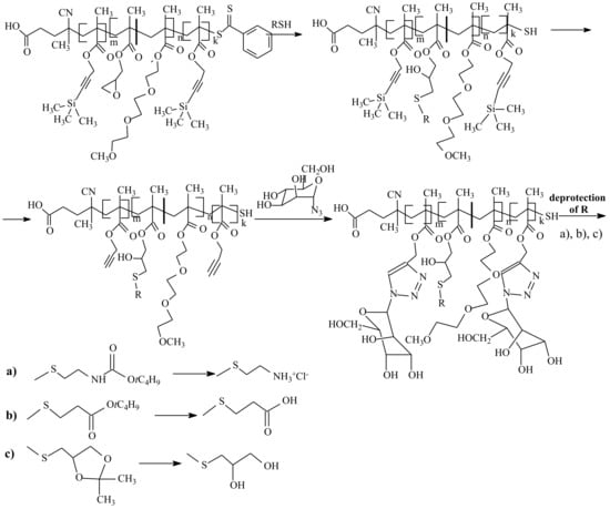 A clickable RAFT agent should contain one of the suitable functional groups, e.g., −N3, −C≡C, −C=C, −N=C=O, etc. Their locus in the leaving group R seems preferable from the viewpoint of the RAFT agent synthesis. In contrast, the presence of −SH, which is also attractive for clicking in the initial RAFT agent structure, seems inappropriate because of the high probability of thiol participation in conventional chain transfer reactions that affects the RAFT polymerization mechanism.