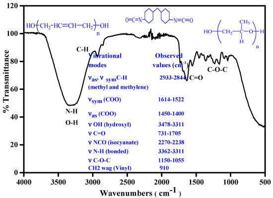 The properties of the PU dispersions can be analysed from hydrogen boding which is developed due to inter and intra chain interactions. The hydrogen bonds are developed due the urethane linkage which contributes to the hydrogen bonding. The hydrogen bonding further dictates the size distribution and morphology of the PU chains. The increase in the hydrogen bonding results in better phase separation. The sensitivity of the FTIR in the carbonyl region provides a glimpse about the phase separation [27,28]. The formation of WBPUD takes place in multistep and it is responsible for the development of appropriate linkages. Hence, the analysis of FTIR technique is appropriate to form an idea about the development of anticipated linkages and can be considered as valid information about the confirmation of the desired product [18,24]. The FTIR spectrum of final stage for the formation of WBPUD is given in Figure 2, which represents the dispersion of PU chains in the deionized water. Figure 2 also shows that the developed linkages can be tracked from IR frequencies. The intensity of IR bands represents the amide and hydroxyl group. It also represents the absence of −NCO group, which is present due to DMPA. The presence of −OH functional group is observed in 3478–3311 cm−1, it is of prime interest that the OH group is present in the macrodiols, however the −OH of macrodiol reacts with −NCO of diisocyanate to develop urethane linkages generating −NCO terminated chains and these chains are later on terminated with −OH containing short chain diol. Moreover, the polymer chains are dispersed in water which has produced a broad band in the spectrum. The distinctive peak of methylene groups is observed at 2933–2844 cm−1 for both symmetric and asymmetric vibrations. The ether linkage C−O−C appears in the range of 1155–1055 m−1. The characteristic NCO peak of diisocyanate has been appeared at 2259–2256 cm−1 however, the vanishing of the IR peak shows the utilization of −NCO group into urethane linkage with the help of OH group. The characteristic carbonyl peak arises at 1731–1705 cm−1. The −NH group has shown multiple options to develop hydrogen bonding, which may be present either in “SS” or in “HS” segment contents. It is also noticeable that the hydrogen bonding of HS–HS is stronger as compared to HS–SS, making the HS interactions responsible for phase segregation [25,26].