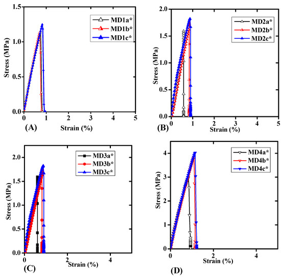 Figure 3 shows the representative curves of probe tack analysis for WBPUD. The test was conducted to analyse the adhesion/tack behavior of the samples. The figure represents the compositions of all samples with HTPB and PPG in different combinations. Figure 3 part A shows three representative curves of HTPB (Mn = 2912 g/mol−1) with PPG (Mn = 425 g/mol−1). For each concentration of HTPB; 5%, 10%, and 15 mol%, a linear trend was observed in the initial stage of stress–strain (σ-ε) curves until it attained the σmax point of the curve. A sudden drop of σmax curve was observed without any fibrillation. Surprisingly, the inception of cavities was observed for three samples of MD4a*, MD4b*, and MD4c* at 2.97, 3.87, and 4.06 MPa, respectively, which was highest among all the analysed samples. The similar trend of σmax was observed regularly. However, neither of the curves produced a plateau, which confirmed the absence of fibrillation. The abrupt descent of the (σ-ε) curves indicated a quick crack development and its prompt propagation at low ε value. The values of ε were not significant. Apparently, no change in the representation of curve was observed. All the samples indicated a tack free behavior, suggesting a rigid and dried material with anti-tack properties. The samples have also shown the poor adhesion energy (Ea) as the minimum Ea under the (σ-ε) curve was detected. The lower (Ea) indicated that the material was non-stick in nature. It was also observed that the high molecular weight macrodiols have been resulted in anti-tack behavior [14,18].