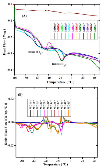 Thermograms of DSC of MD Series of WBPUD; (A) DSC thermograms of heat flow w.r.t temperature; (B) DSC thermograms of Derivative heat flow w.r.t temperature. Numbers 1–4 in both graphs shows the molecular weight of PPG Mn = 425, 1000, 2000, and 2700 g/mol−1, respectively. The letters with an asterisk (a*, b*, and c*) show concentrations of HTPB as 5 mol%, 10 mol%, and 15 mol%, respectively. Whereas, the asterisk symbol(*) represents the molecular weight of HTPB (2912 g/mol−1).