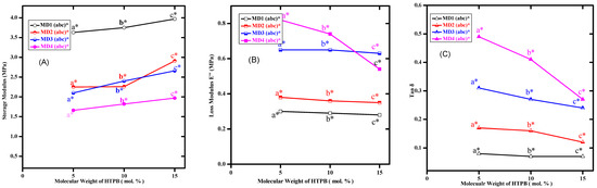 Representation of DMA parameters of MD series of WBPUD. (A) Relationship between storage modulus and molecular weight of PPG; (B) relationship between loss modulus and molecular weight of PPG; and (C) relationship between Tanδ and molecular weight of PPG. (Numbers 1–4 in both graphs show the molecular weight of PPG Mn = 425, 1000, 2000, and 2700 g/mol−1, respectively; letters a, b, and c symbolise contribution of macrodiol HTPB as 5, 10, and 15, respectively, in moles. Whereas, the asterisk symbol(*) represents the molecular weight of HTPB (2912 g/mol−1).