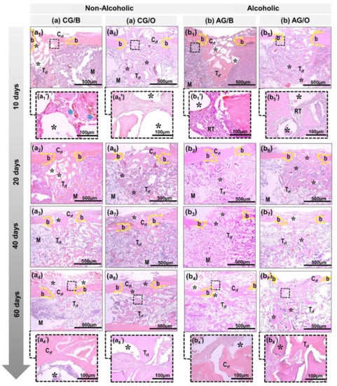 Details of the evolution of bone repair of defects in tibias created in non-alcoholic (CG/B and CG/O) animals and alcoholic (AG/B and AG/O) animals, and animals treated with Bio-Oss® (a1–a4,b1–b4) or OrthoGen® (a5–a8,b5–b8), at 10, 20, 40 and 60 days. Abbreviations: defect border (b); newly formed cortical bone (Crf); biomaterial particle (asterisk); newly formed trabecular bone (Trf); bone marrow (M); blood vessels (blue arrow); and tissue reaction (RT). Hematoxylin and eosin; original magnification 10×; bar = 500 µm and Insets, magnified images 40×; bar = 100 µm (a1′,a4′,a5′,a8′,b1′,b4′,b5′,b8′).