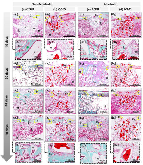 Details of the evolution of bone repair of defects in tibias created in non-alcoholic CG/B and CG/O animals and alcoholic AG/B and AG/O animals, and animals treated with Bio-Oss® (a1–a4,b1–b4) or OrthoGen® (a5–a8,b5–b8), at 10, 20, 40 and 60 days. Abbreviations: defect border (b); newly formed cortical bone (Crf); biomaterial particle (asterisk); newly formed trabecular bone (Trf); bone marrow (M); newly formed collagen fibers (green arrow); tissue reaction (RT). Masson trichrome; original magnification 10×; bar = 500 µm and insets, magnified images 40×; bar = 100 µm (a1′,a4′,a5′,a8′,b1′,b4′,b5′,b8′).