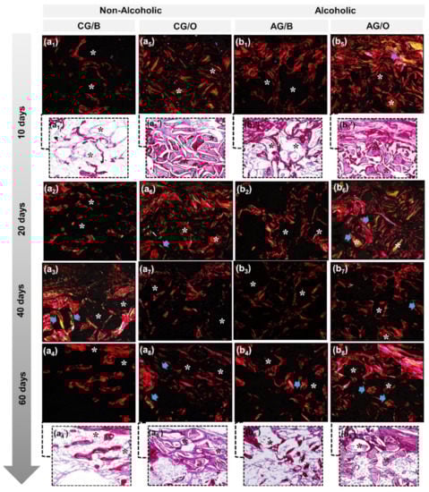 Birefringence analysis of newly formed collagen matrix by polarized microscopy exemplified in non-alcoholic (CG/B and CG/O) animals and alcoholic (AG/B and AG/O) animals, treated with Bio-Oss® (a1–a4,b1–b4) or OrthoGen® (a5–a8,b5–b8) at 10, 20, 40 and 60 days. New bone formation with red-orange birefringence, referring to the osteoid matrix, gradually changing to greenish-yellow (blue arrow) at the end of the experimental period, xenograft, Bio-Oss®, identified by a dark background field (asterisk) and allograft parts dark field and parts by birefringence of collagen fibers corresponding to the organic portion of the biomaterial. Staining with Picrosirius Red, original magnification 10×. Magnified images 40× (a1′,a4′,a5′,a8′,b1′,b4′,b5′,b8′).