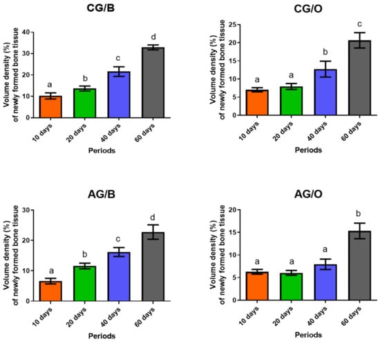 Quantification of the percentage of new bone tissue (mean ± SD) of the experimental groups in the analyzed periods. Different lowercase letters (line) indicate a significant difference between the analyzed periods. (a ≠ b ≠ c ≠ d). Significant differences (p < 0.05). Non-alcoholic groups (CG/B and CG/O) alcoholic groups (AG/B and AG/O), and animals treated with Bio-Oss® (CG/B and AG/B) or OrthoGen® (CG/O and AG/O), at 10, 20, 40 and 60 days.
