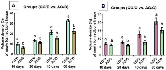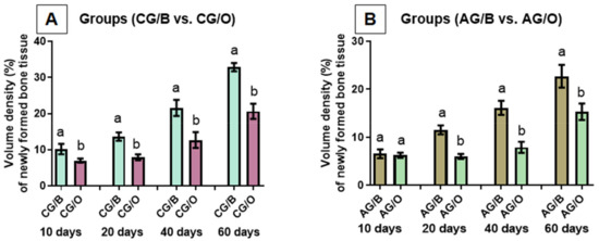 Comparison of the percentage of new bone tissue (mean ± SD) of the groups with the same liquid diet of water (A), non-alcoholic or (B) alcoholic (25% v/v ethanol), with different graft materials. Different lowercase letters indicate a significant difference between the analyzed groups (a ≠ b). Significant differences (p < 0.05). Non-alcoholic groups (CG/B and CG/O) alcoholic groups (AG/B and AG/O), and animals treated with Bio-Oss® (CG/B and AG/B) or OrthoGen® (CG/O and AG/O), at 10, 20, 40 and 60 days.