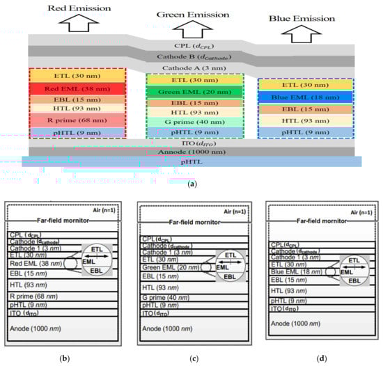 (a) The structures of red, green, and blue organic light-emitting diode (OLED) and simulation of (b) Red OLED, (c) Green OLED, and (d) Blue OLED.