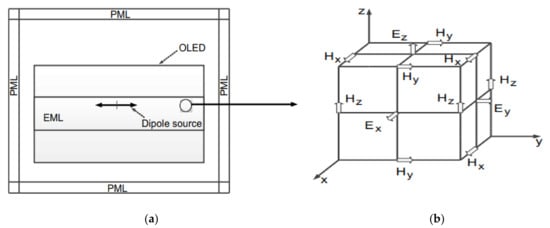 (a) Simulation of OLED with finite-difference time-domain (FDTD) method and (b) Yee cell in simulation.