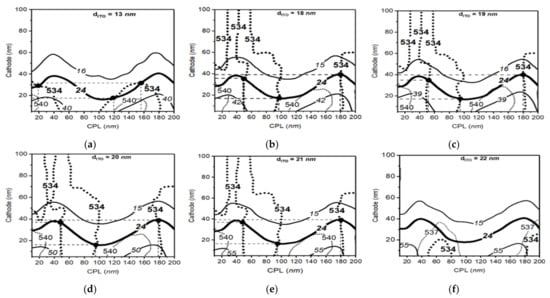 The parameter space result of green structure with indium tin oxide (ITO) thickness from 13 to 22 nm. Solid lines and dotted lines in the figure show the calculated output lines in each optical thickness of the capping layer (CPL) and cathode layer. Bold lines in the figure represent the desired optical conditions with the peak wavelength of 534 nm and bandwidth of 24 nm for the green OLED (a–f).
