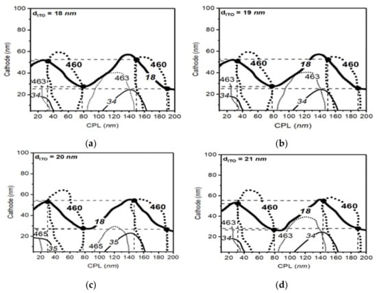 The parameter space result of blue structure with ITO thickness from 18 to 21 nm. Solid lines and dotted lines in the figure show the calculated output lines in each optical thickness of the CPL and cathode layer. Bold lines in the figure represent the desired optical conditions with the peak wavelength of 460 nm and bandwidth of 18 nm for the blue OLED (a–d).