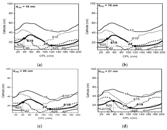 The parameter space method was applied to calculate the optimized point including the desired peak wavelength and bandwidth. As mentioned before, we calculated the optimized optical path length n (refractive index) × d (thickness) as functions of thickness of the inorganic layers the CPL, the Cathode, and the ITO because change in the organic films can induce the deterioration of the electro-optical properties. The thickness ranges of ITO, Cathode, and CPL were set in the ranges of 13–22 nm, 5–100 nm, and 10–200 nm, respectively [20].