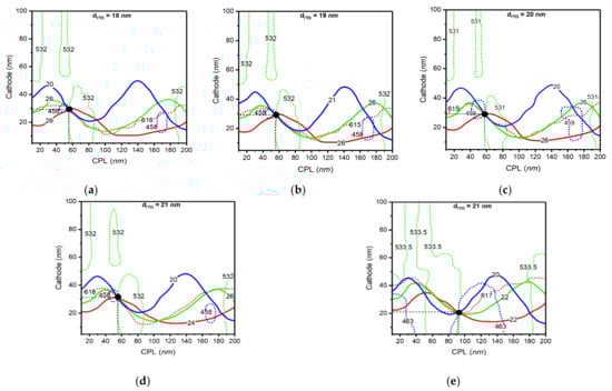 Calculated parameter space for the Red, Green, and Blue organic light-emitting diode (OLED) cell. (a–e) Optimized points for three colors with smallest error at from the indium tin oxide (ITO) thickness of 18 nm to 21 nm. Solid lines and dotted lines in the figure show the calculated output lines in each optical thickness of the capping layer (CPL) and cathode layer.