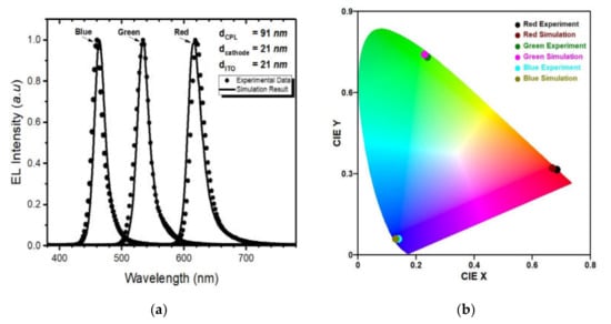 (a) Comparison of the measured optical spectrum and the calculated spectrum of the red, green, blue OLED cell and (b) CIE coordinates at the CPL thickness of 91 nm, the cathode thickness of 21 nm, ITO thickness of 21 nm.