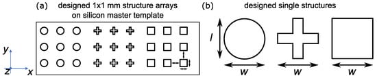 To fabricate the silicon master template, e-beam lithography (eLine Plus, Raith, Germany) was used. For this purpose, circular, cross, and square shaped structures with a width w, length l and spacing of 3 m each was designed (see Figure 1). The polydimetylsiloxane (PDMS) stamp was fabricated as a hybrid stamp comprising hard-PDMS (h-PDMS) and soft-PDMS (s-PDMS) on a glass carrier. h-PDMS is prepared by mixing component A (100 g vinylmethylsiloxane–dimethylsiloxane trimethylsiloxy-terminated copolymer (AB112958), 0.38 g platinum–divinyltetramethyldisiloxane complex (AB153234) and 1.27 g 1,3,5,7-tetravinyl-1,3,5,7-tetramethylcylotetrasiloxane (AB109175) purchased from ABCR GmbH) and B (methylhydrosiloxane–dimethylsiloxane copolymer (AB109380), purchased from ABCR GmbH)) in a weight ratio of 3:1. The mixture was spin-coated for 20 s at 1000 rpm on the silicon master. After drying for 20 min at 65 C, s-PDMS was drop casted onto h-PDMS and covered with the pre-cleaned glass carrier. s-PDMS is prepared by mixing the base and curing agent SYLGARDTM 184 (purchased from Dow Corning) in a weight ratio of 10:1. Afterward, the construction was cured overnight at 65 C. The silicon master template can separated gently and the hybrid mold can be used for imprinting [9,10].